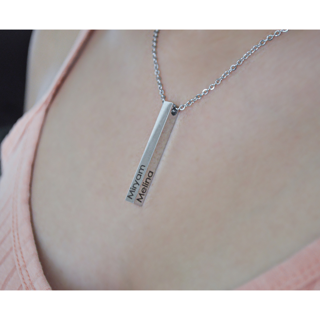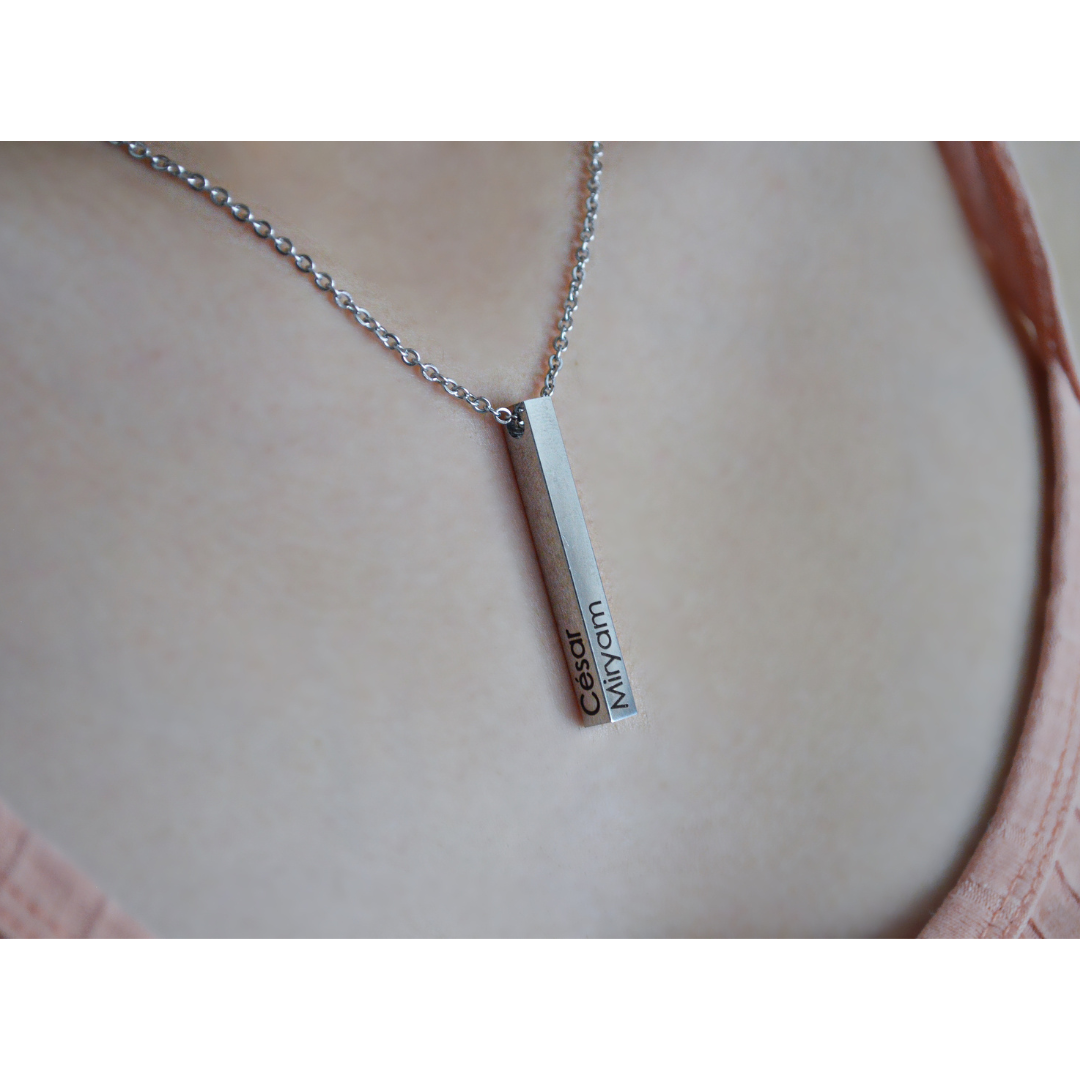 Increíble collar de barra 3D personalizado resistente al agua, no se despinta ni causa alergia en la piel. Podemos personalizar desde una hasta las cuatro caras del collar. Les grabamos cualquier texto, ya sea algún nombre, fecha, palabra, iniciales, frase corta, etc. Puedes elegir el tipo de letra así como también entre color dorado y plateado. Por su versátil diseño es perfecto como regalo para ti, para parejas, mejores amigo/as o para quien tú prefieras.